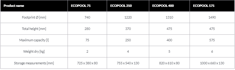 ECOPOOLS hemen kullanıma hazırdır ve şeklini koruyan sert yakaları sayesinde herhangi bir destek çerçevesi gerektirmez. Tüm havuzlar taşıma için kolayca katlanır ve kendi saklama çantası ile birlikte verilir.